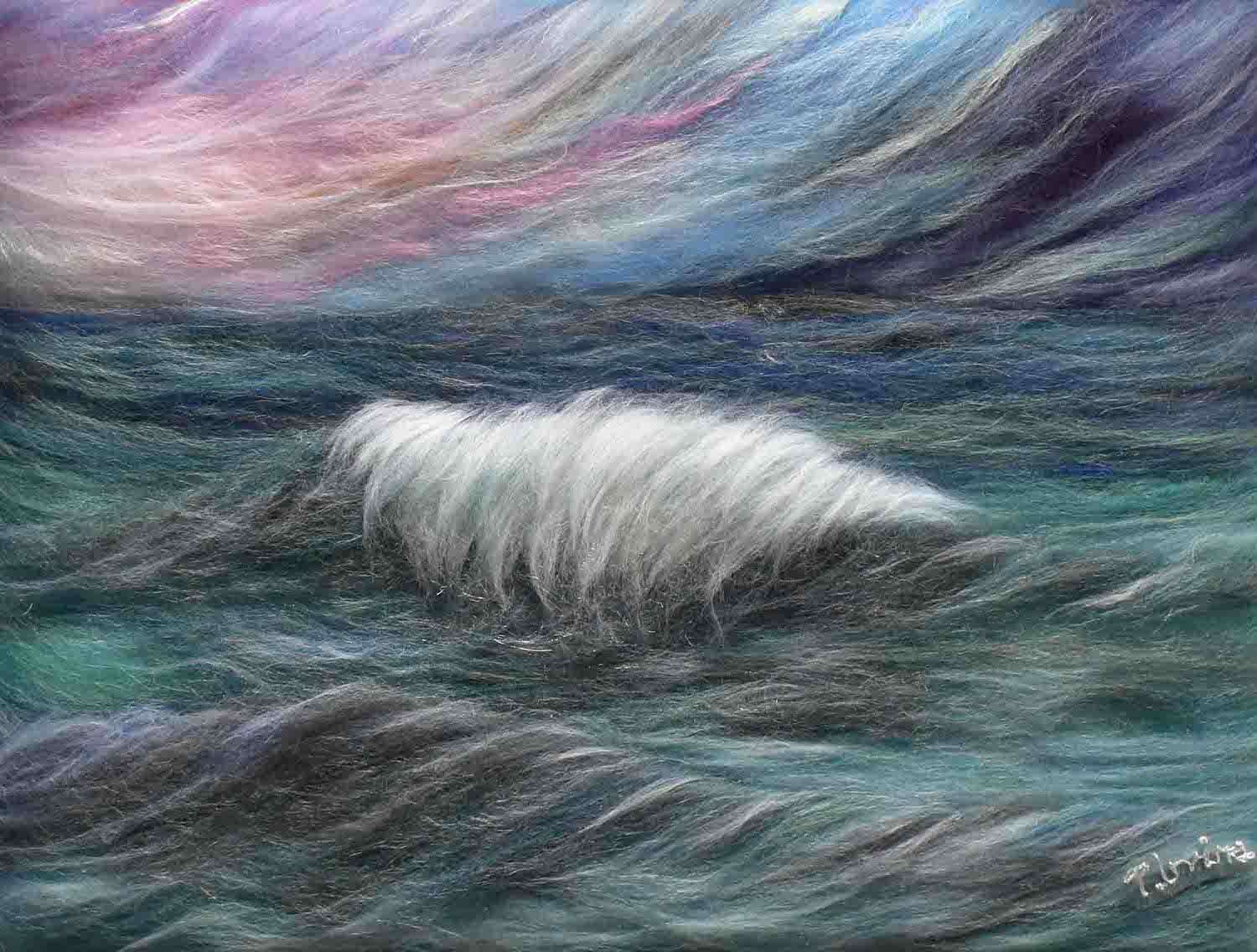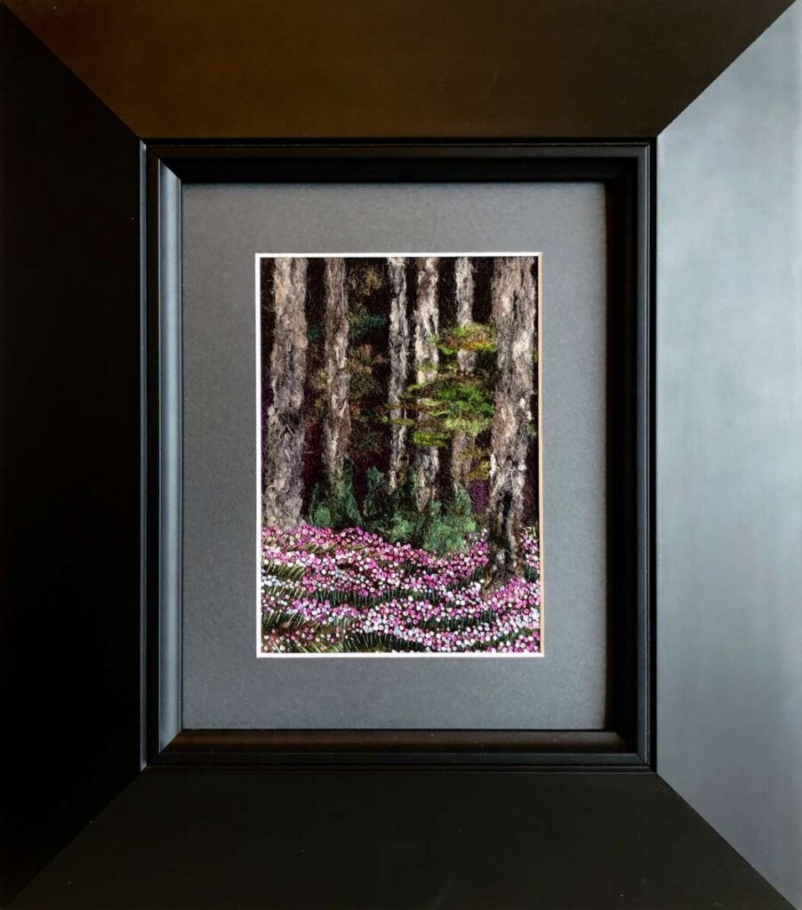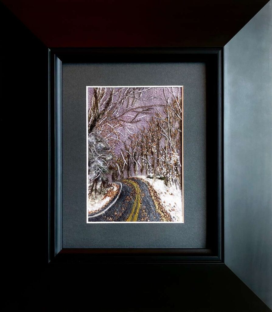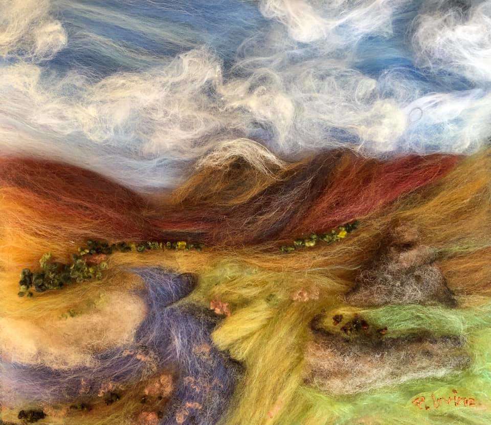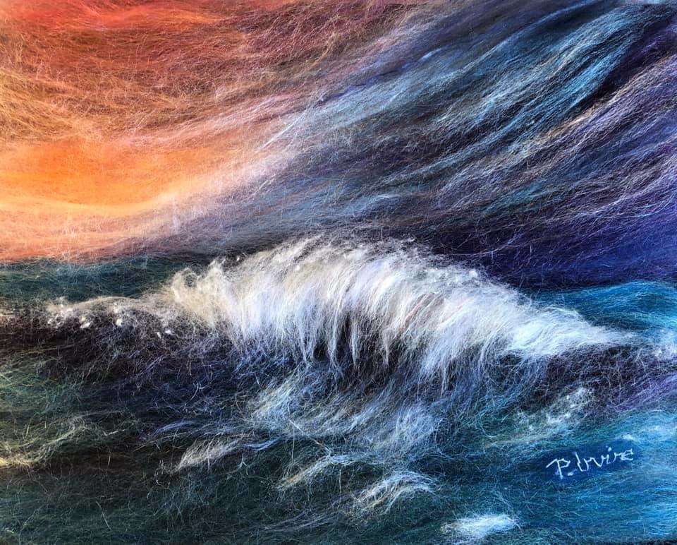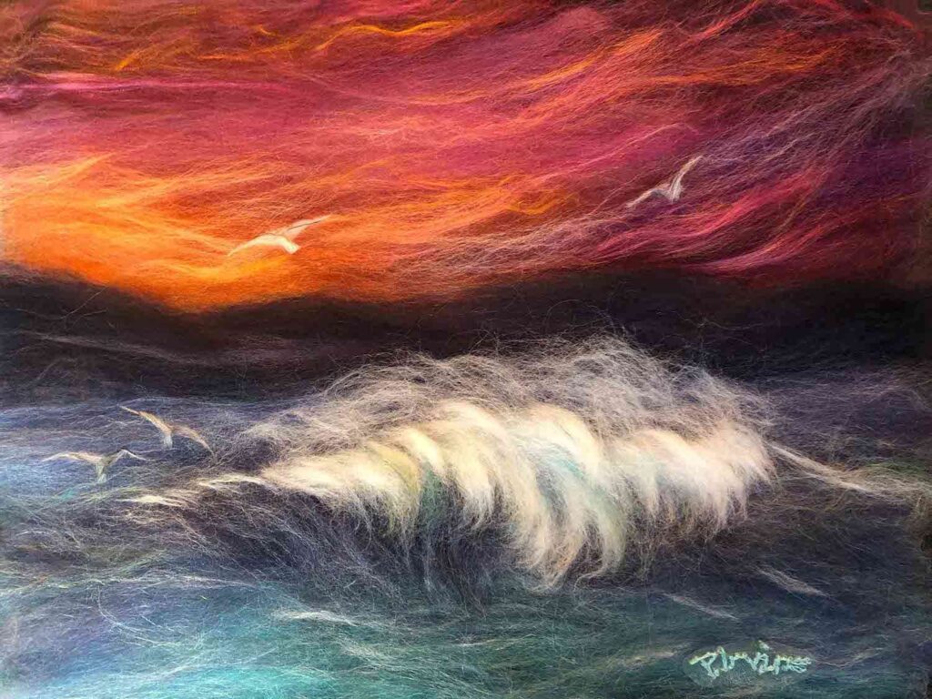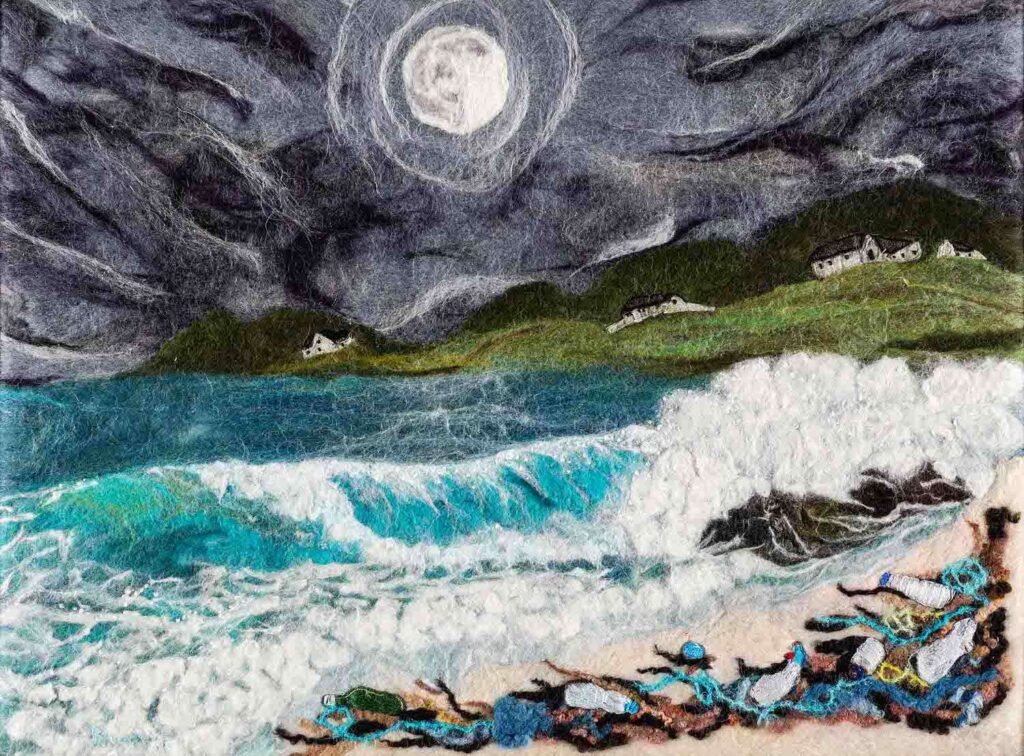 A seascape to raise awareness of plastic pollution on the beautiful beaches of the Outer Hebrides. A Wet felted background with needle felted detail. The houses are made from silk carrier rods. Hand embroidered French knots for the ocean spray. All the plastic pollution was embroidered on cotton then cut out and stitched onto the painting with felt padding inside each piece to make it more 3D. This was a beach where I used to live and all the pollution on the beach was from photographs I took of the rubbish there.
