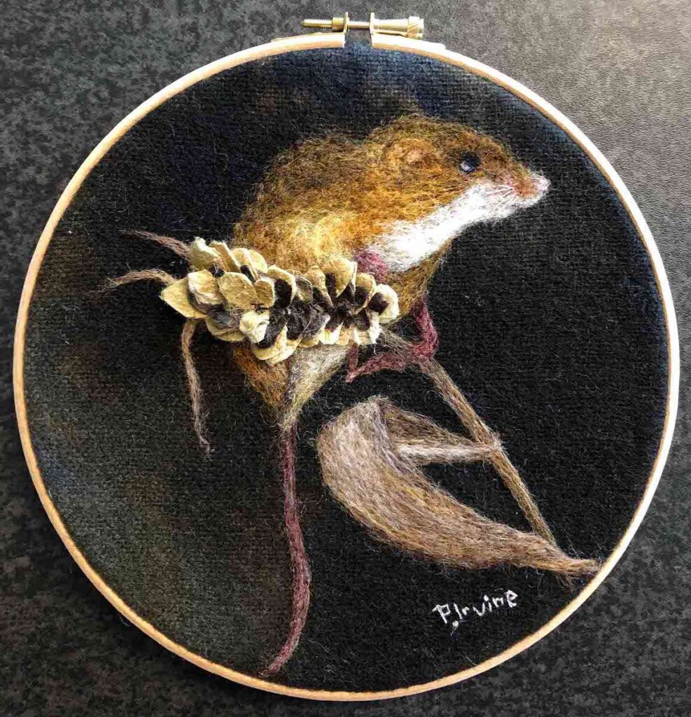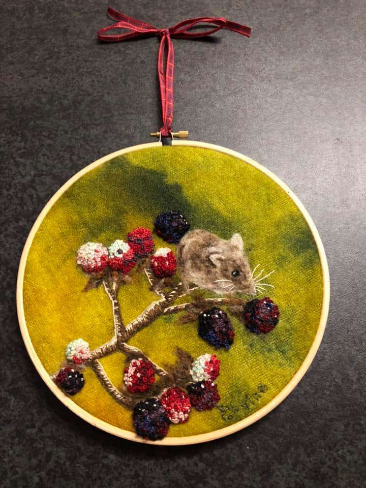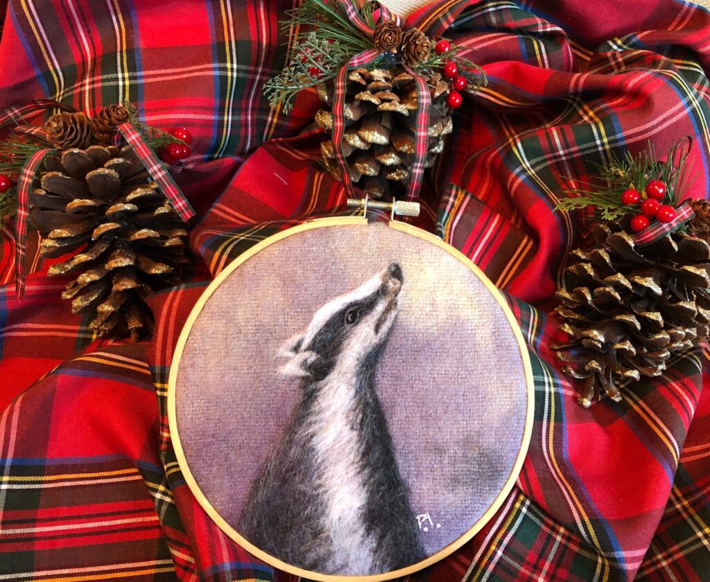 My original fibre art / textile art Badger. It is framed in a 6” embroidery hoop and is felted onto hand dyed blanket material.