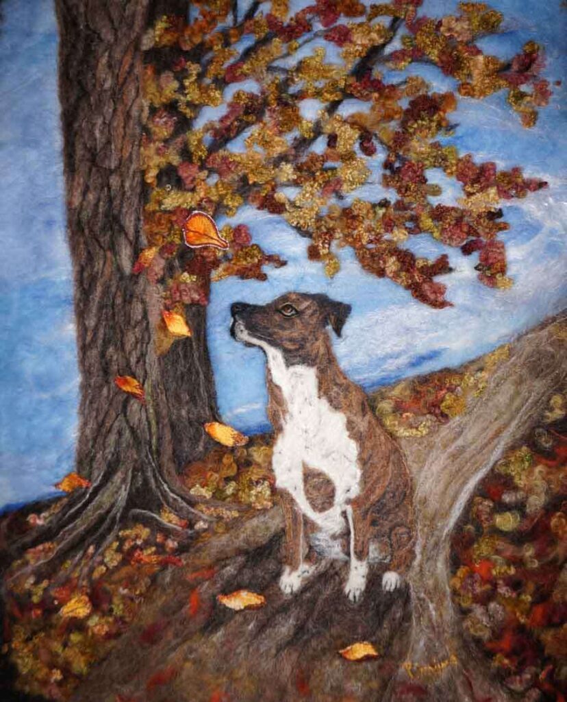 Jabo was a commission for a customer in France. He is the customers dog. It is a wet/needle felted piece. The leaves were hand embroidered using stump work embroidery and then stitched onto the piece.