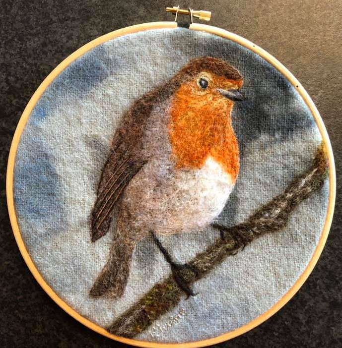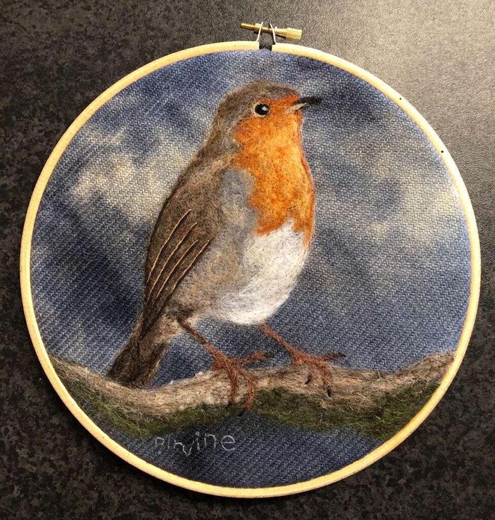 This Robin was commissioned as a present for the customers Mother. It is mounted in an 8″ embroidery hoop.